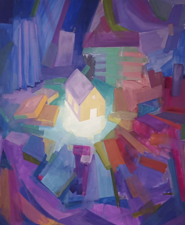 Formal Analysis: The art piece is of a house centered in the middle of a gathering of unspecified objects. The piece is paint on a paper background. All of the colors used to colored the unspecified objects are relatively cold, and are muted in intensity, featuring oranges, blues, blue-greens, and maroon reds. These colors are meant to make those surrounding areas unfriendly and foreign, seen as cold and uncomfortable, while the center of the page is colored with a warm glow of yellow and white-green, which creates an inviting and calming feeling. The use of shapes as the surrounding objects; unidentified and indistinct gives an unsettling tone, while the obvious silhouette of the house (which is a common object) is much more recognizable and comforting.